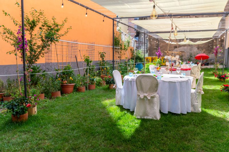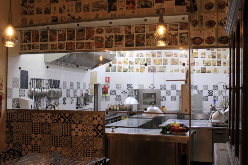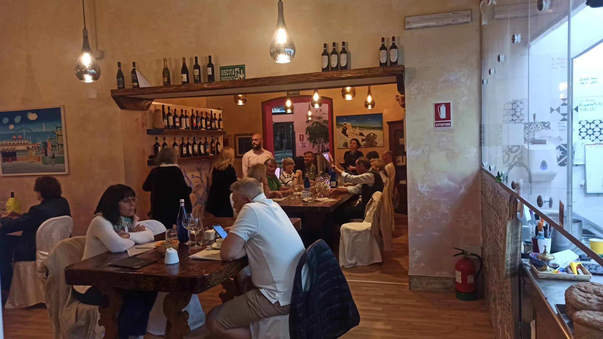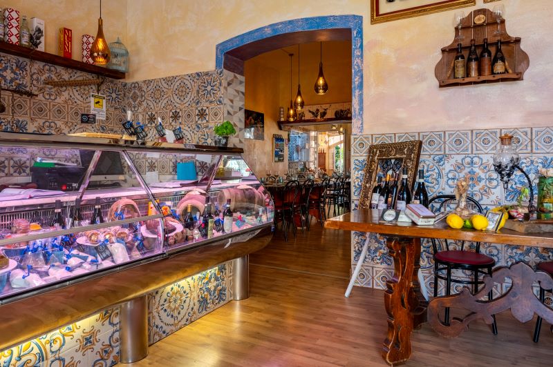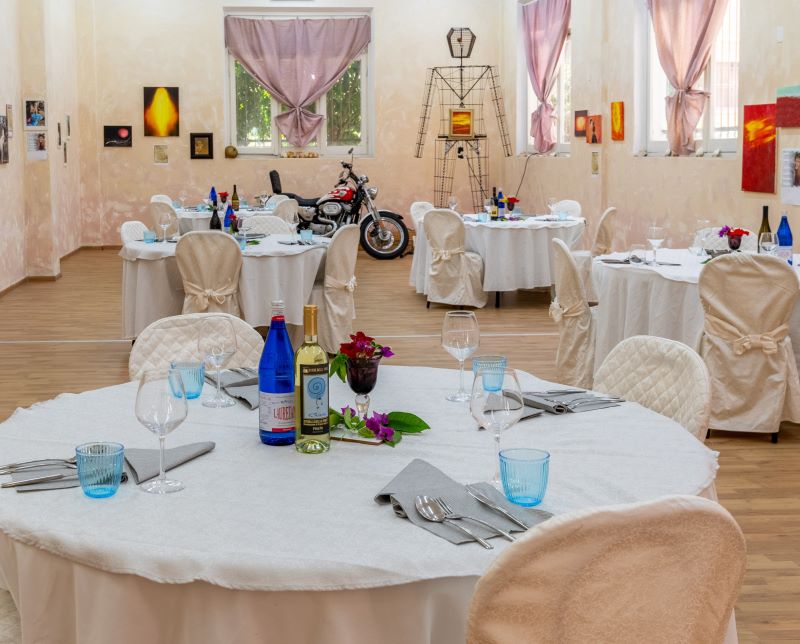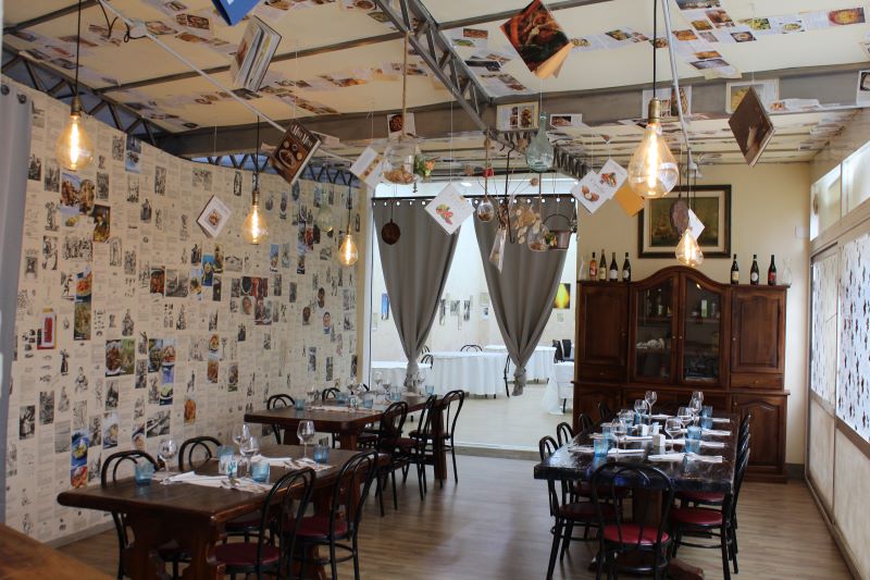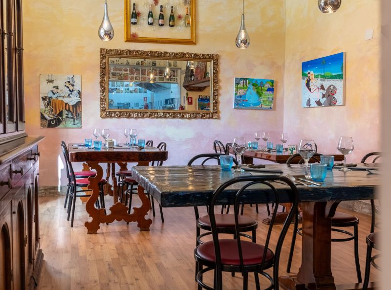 Troviamo subito un insieme di colori festosi, di quadri, di bottiglie e molti tavoli in legno; passando per le prime sale si arriva alla cucina, completamente a vista; e poi nella veranda dove si è come proiettati in un altro mondo. Proseguendo, troviamo il salone grande dove si tengono cerimonie, feste, riunioni e mostre d’arte; fuori dalla veranda imbocchiamo un vialetto di ghiaia che porta nel grande giardino immerso nel verde, distante dal traffico tra buganvillee e fioriture varie.